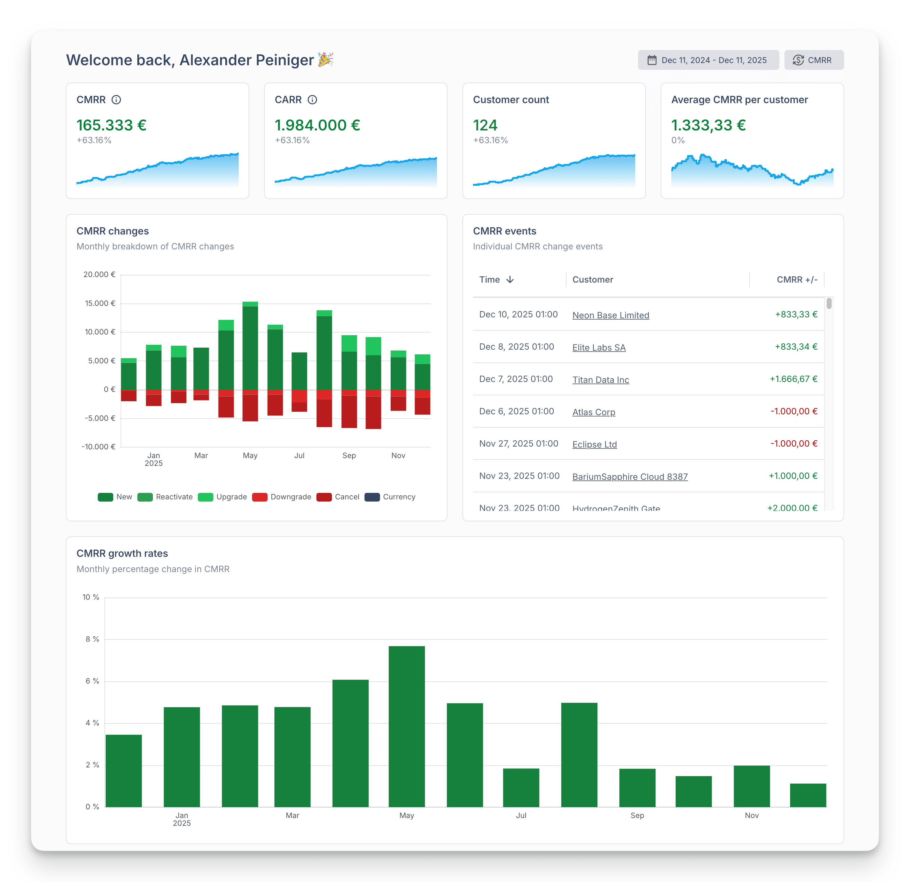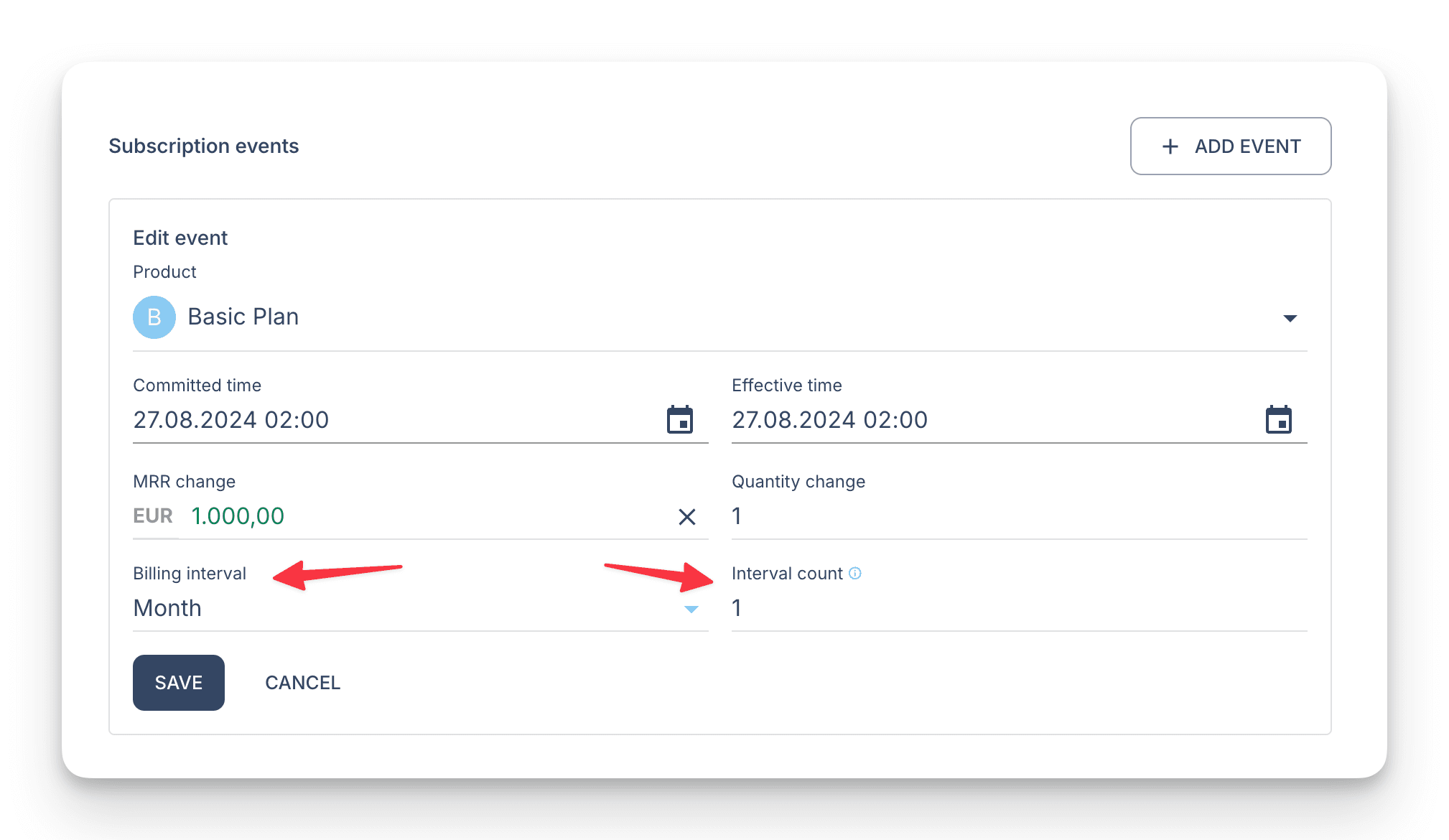 For manually managed subscriptions, you can set the billing interval and count when adding or editing events. This gives you clearer insight into how your customers are billed and helps distinguish between monthly and annual contracts at a glance.